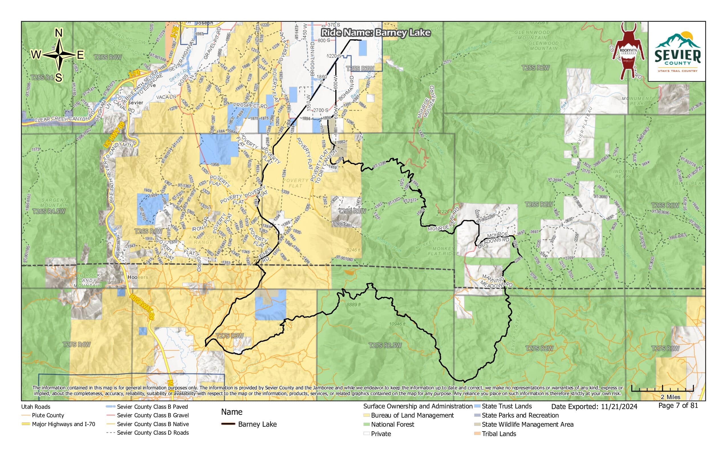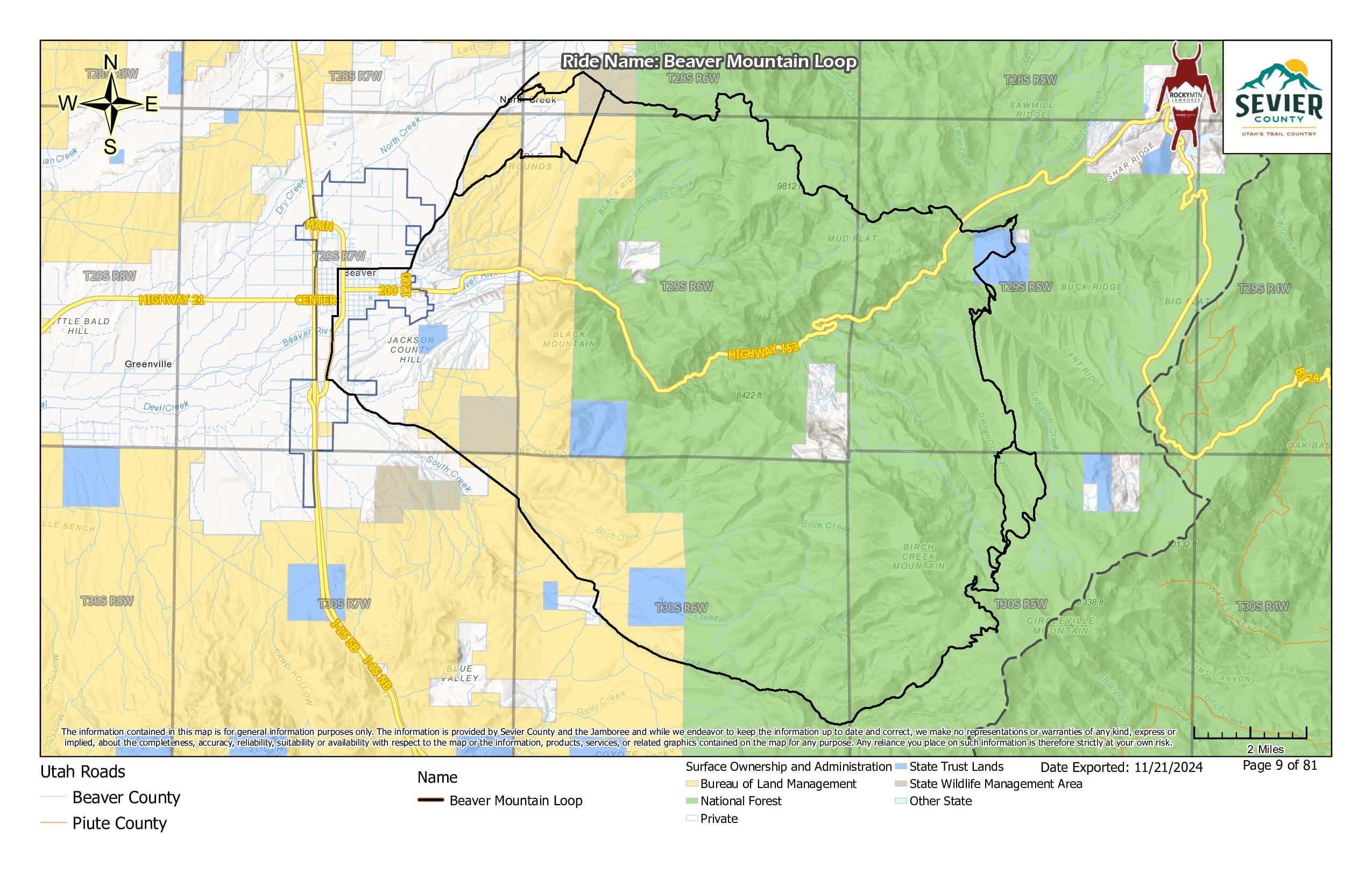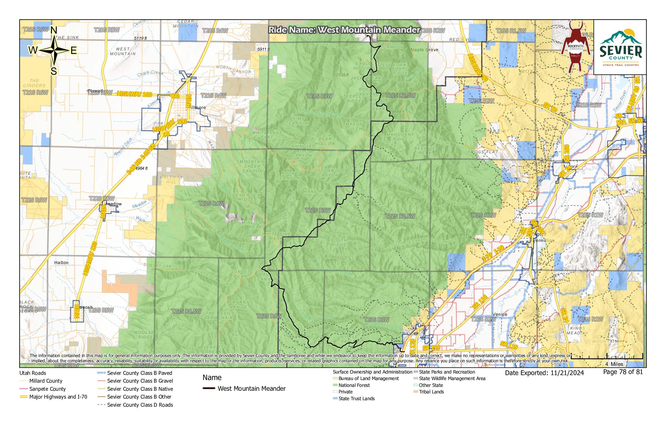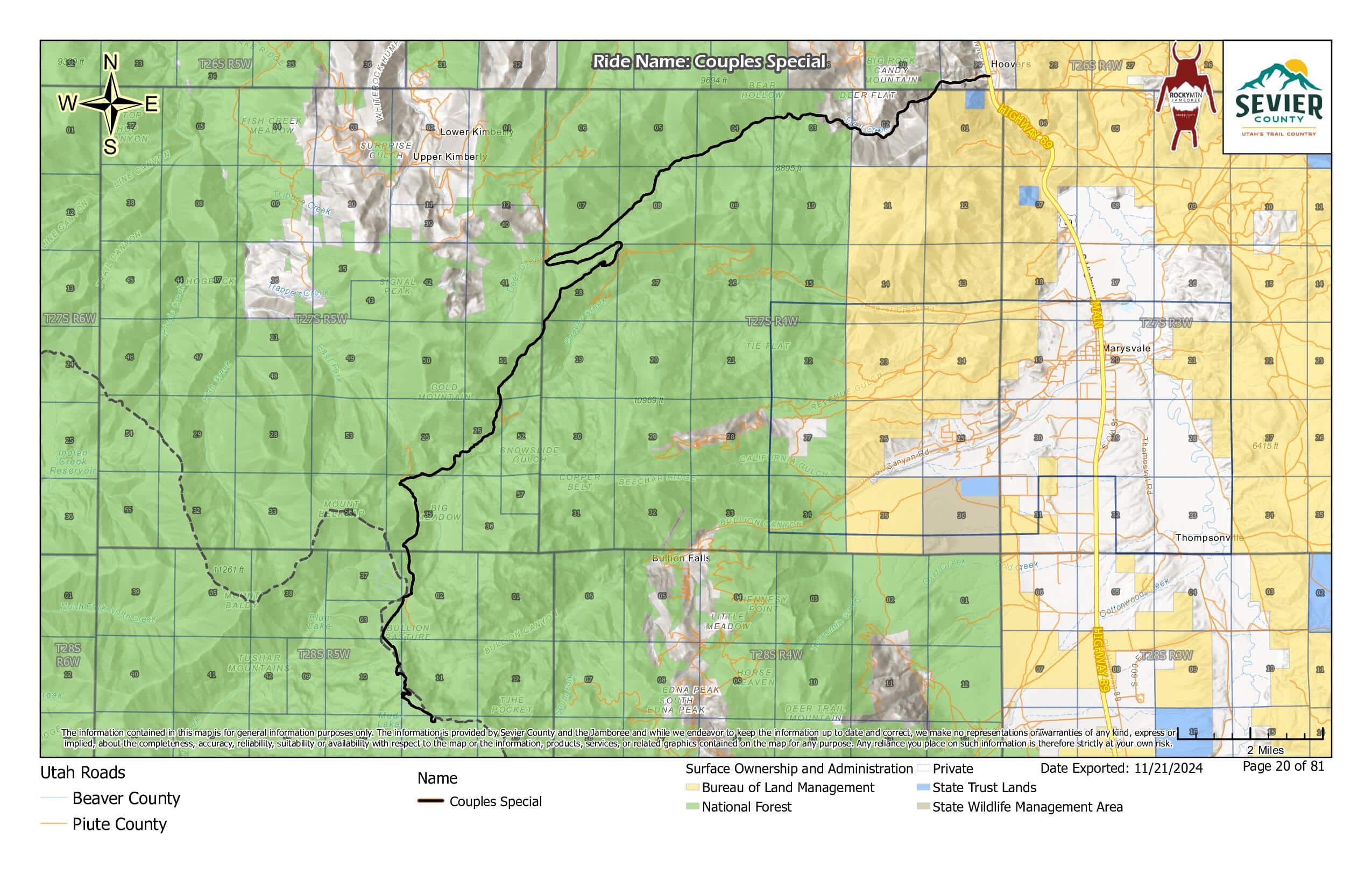 The ride requires you to trailer your machine about 60 minutes to Beaver. Leaving Beaver and wind up steep, twisting, tree-lined trails, travel through flower spotted meadows, negotiate switchbacks through beautiful groves of aspens and finally follow bubbling streams along the Tushar Mountain. On the way back we will travel west back into Beaver. There are several gates we will be passing through that make this ride a 50”. We will stop at several scenic lookouts and see the effects of wide fires in the area.